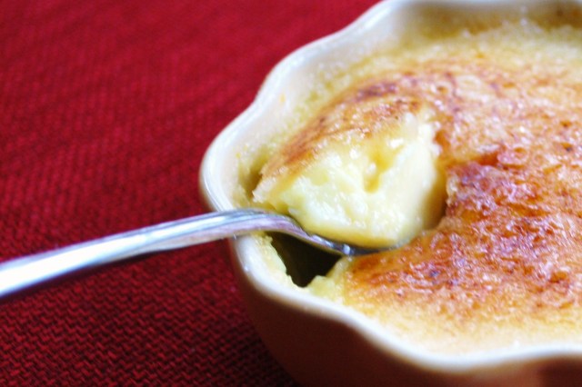 I almost made the same mistake with this recipe, Creme Brulee from Ina Garten’s Barefoot in Paris. I decided to divide it in half, since I only had a pint of cream. So I mixed together one egg and two egg yolks with half the sugar, heated half the cream and mixed it into the eggs, and then proceeded to add a whole teaspoon of vanilla instead of a half. Then I thought to myself, I don’t really think the family will be crazy about this if I add a whole tablespoon of Grand Marnier (the original measurement), so I’ll just add . . . a teaspoon, I guess. Lucky me, that I didn’t go ahead a put the whole thing in, I mean, extra vanilla usually can only be better, but I have a feeling all that orange liqueur in just a half recipe would have resulted in some faces being made at the dinner table.